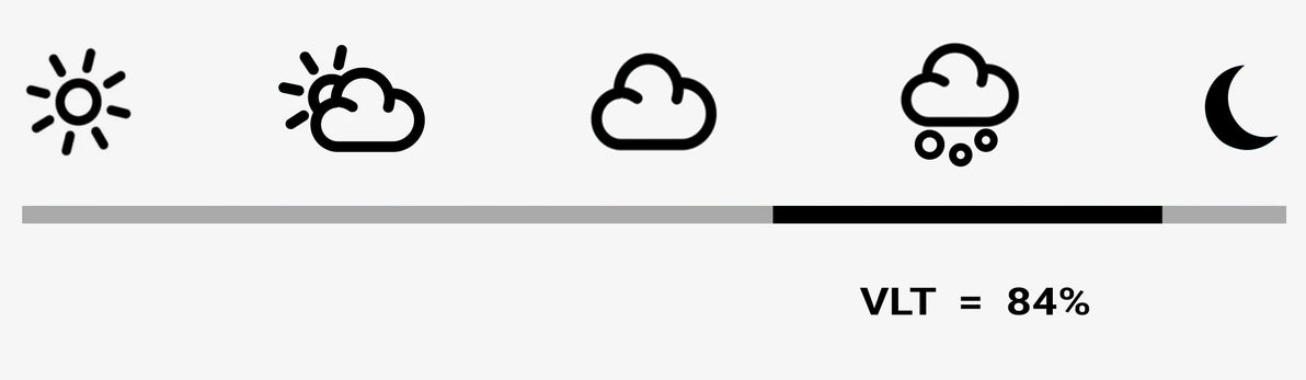 VLT, o transmisión de luz visible, es la medida de la cantidad de luz blanca (visible) que puede pasar a través de una lente y ser detectada por el ojo. Representado como una cifra porcentual, cuanto menor es el número, más oscuro es el tinte de la lente y mejor soporta la luz solar intensa.